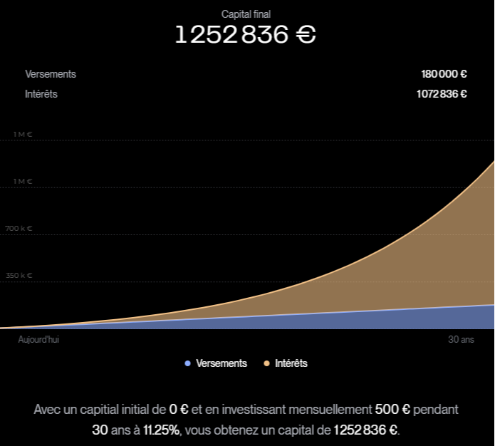 Et si tu veux rêver plus grand, en 30 ans, ce même investissement t'aurait rendu millionnaire.